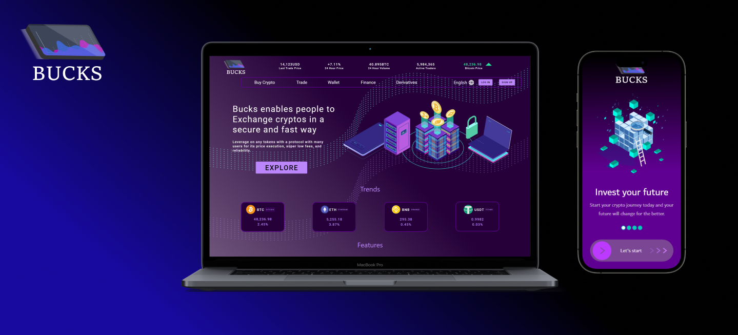 Bucks is a Cryptocurrency exchange website with a modern feel that attempts to make buying, selling, and exchanging crypto coins easy for users with little to no knowledge about crypto nuance.