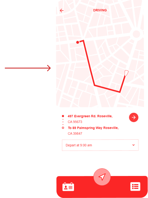 Driving mode is crucial for the user’s perspective. Destination point and departure time are placed under the driving route to give clear information.